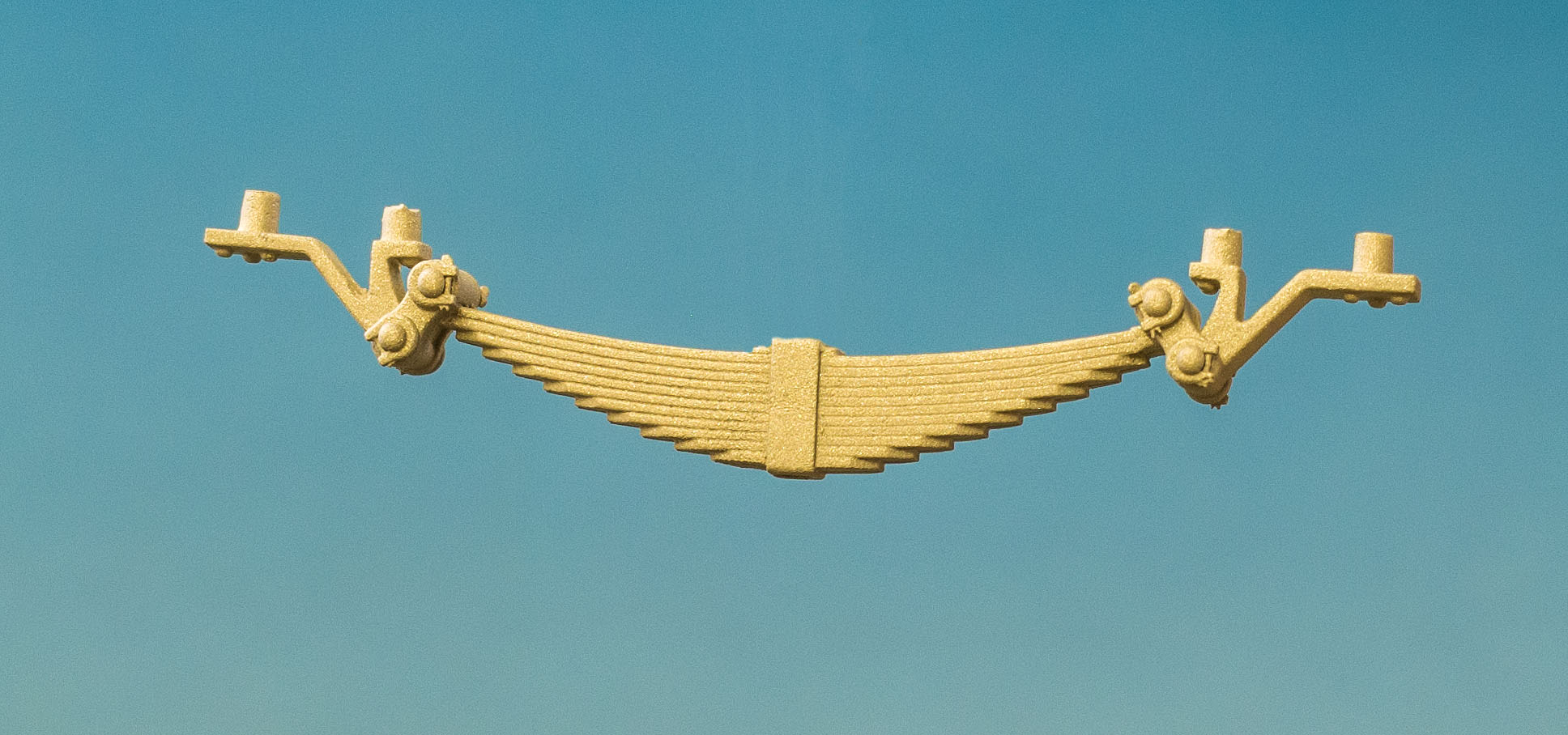 Blattfeder mit Schaken & Schakenböcken, Vorbildlänge 1000mm, 11-lagig, einseitig profiliert, 1 Paar. Messingguß. Gesamtlänge über die Schakenböcke 56,6mm, Federhöhe 6,3mm, Tiefe der Feder 3,0mm.