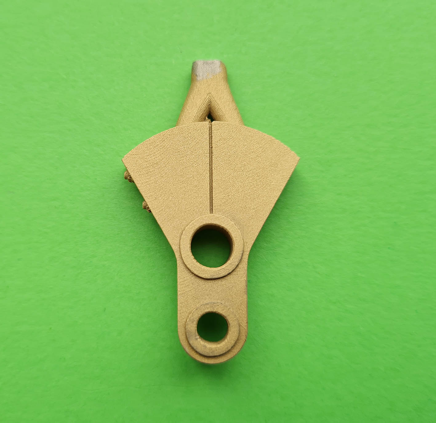 Blindwellenausgleichsgewicht, Höhe=30,9mm, Breite=22,8mm, Tiefe=4,8mm, Achsdurchmesser=5,2mm. Abstandsmaß der Bohrungen Achsmitte zu Kurbelwellenmitte 10,6mm, Messingguß, 1 Paar, NG 2.