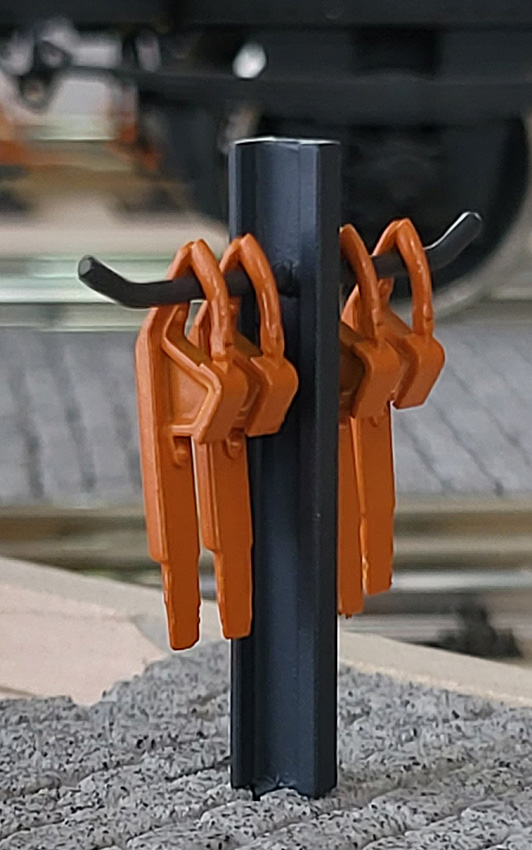 Hemmschuhhalter inkl. 4 Hemmschuhe für Code 250 Profil, max. Schienenkopfbreite 2,7mm. Messingguß, Bausatz.