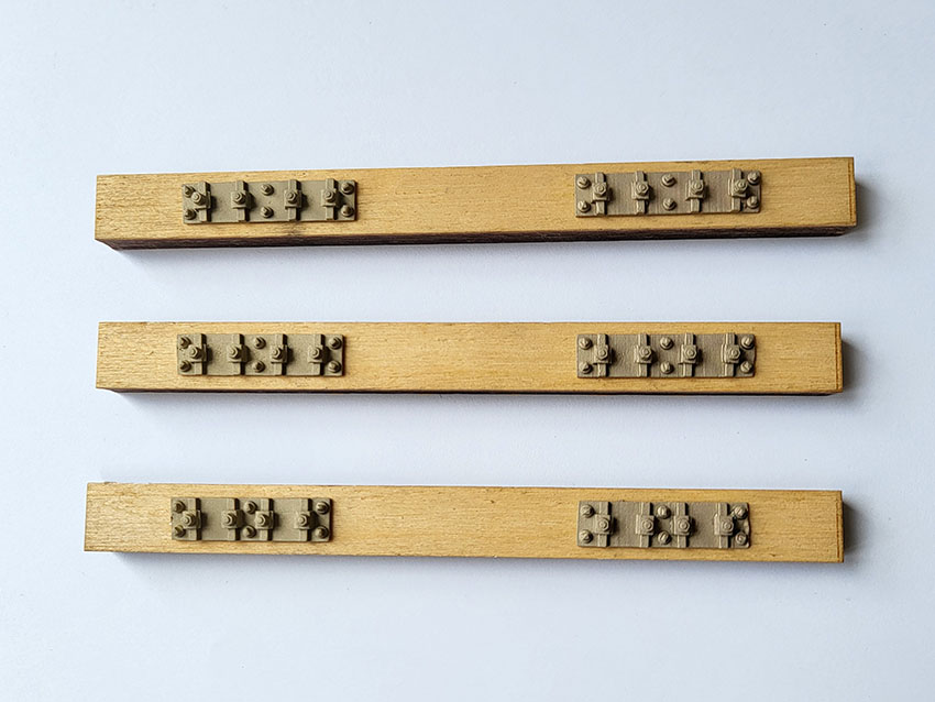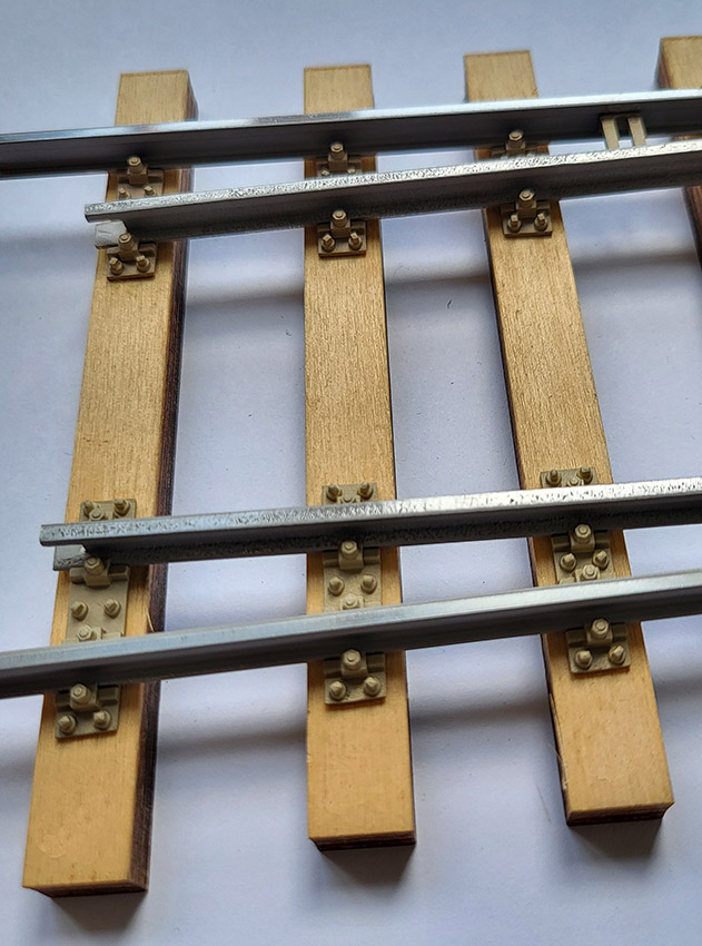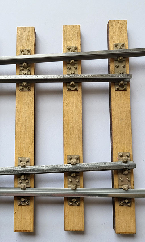 Rippenplatten für den Festpunkt der Zunge. Rechte Ausführung für den hinteren Teil der Weichenzunge, passend für Code 250 Gleisprofil. Hauptabmessung der Platten: goß: 30,0 x 6,4mm, mittel: 28,3 x 6,4mm, klein: 26,6 x 6,4mm. Auf der Rückseite der Gleitplatten befinden sich zwei runde Zapfen mit einem Durchmesser von 2,5mm und einer Länge von 5,0mm zur einfachen Fixierung in der Schwelle. Für eine EW190 - 9, EW190 - 7,5 oder EW190 - 6,6 im Maßstab 1:22,5 in originaler Länge werden je ein Satz linke und rechte Festpunkt - Rp benötigt. Packungsinhalt 3 Stück, Messingguss, NG 2.